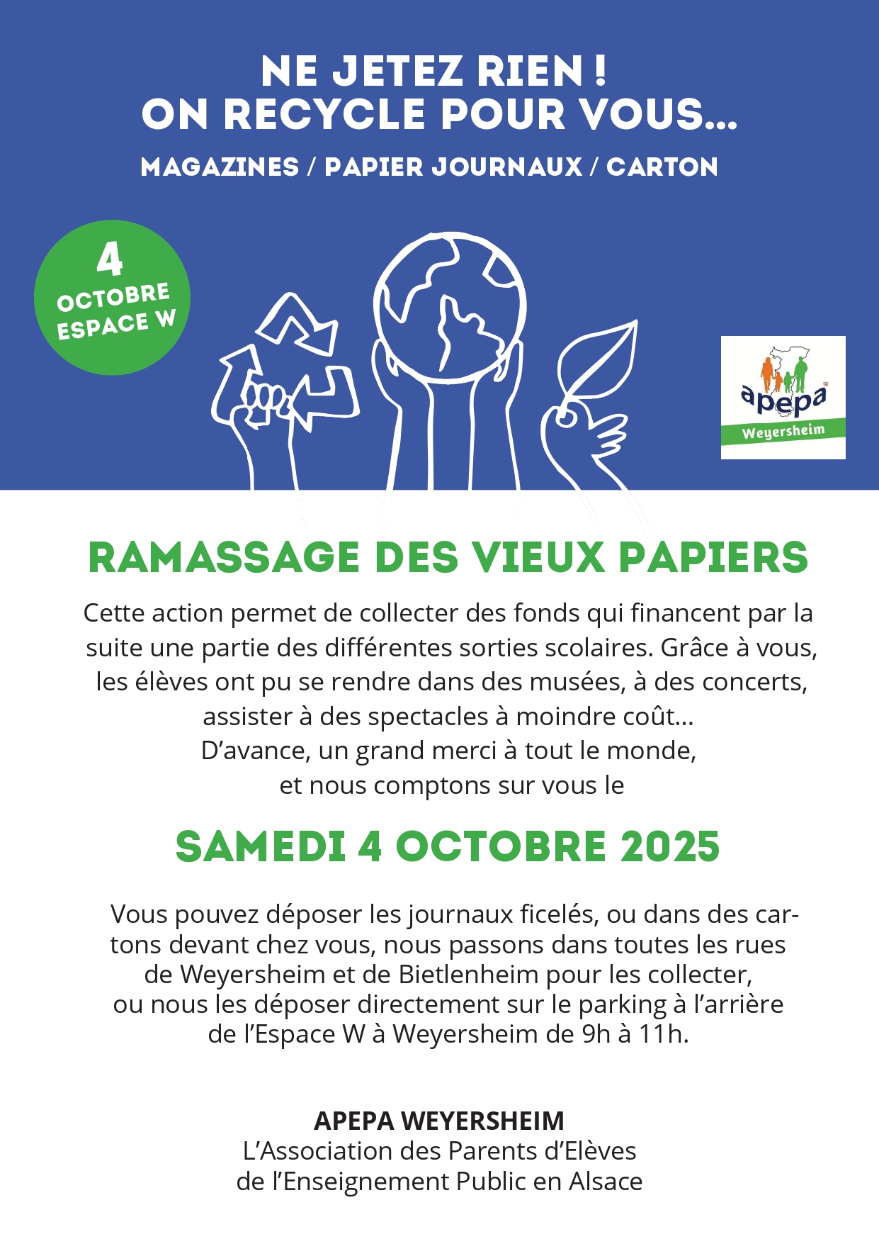 Directement à l'Espace W entre 9h et 11h ou déposez les devant chez vous bien ficelés ou dans des cartons avant 9h.