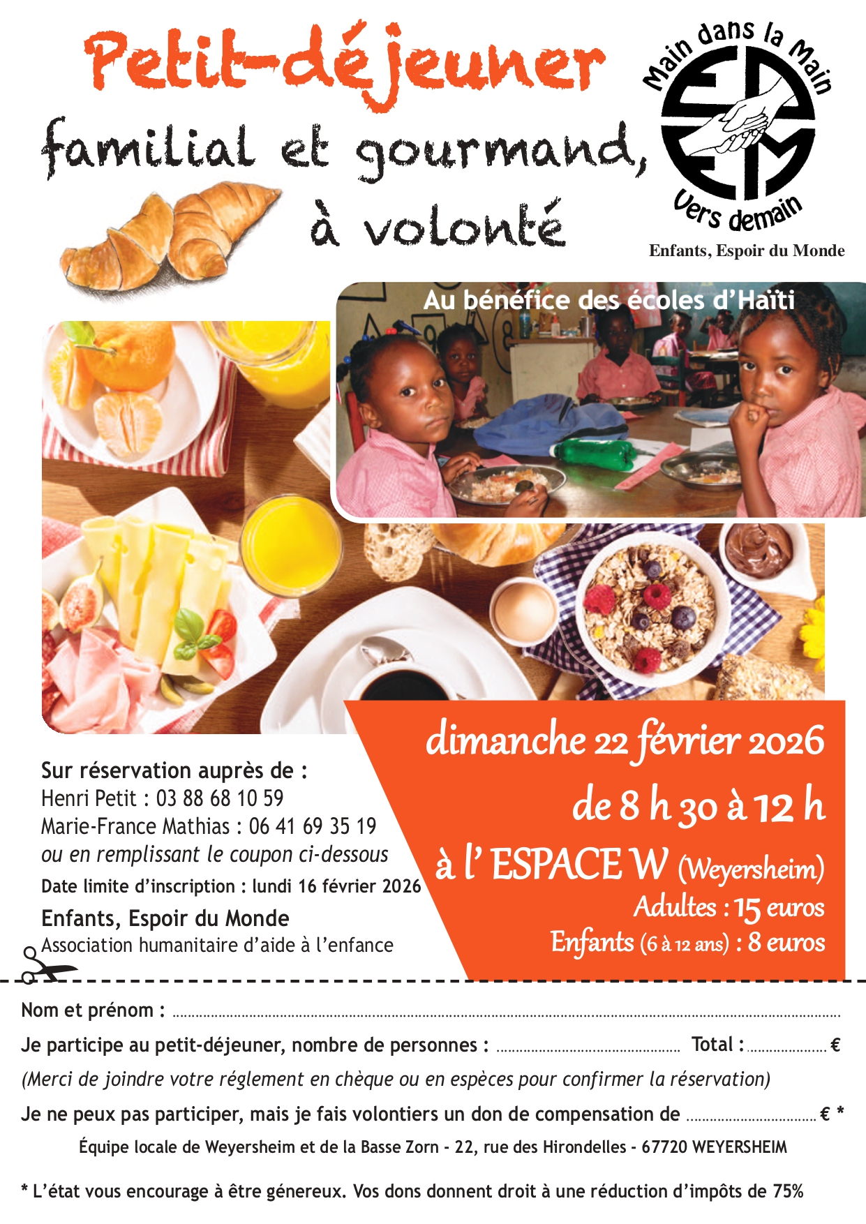 Petit-déjeuner solidaire à Weyersheim, à l’Espace W de 8h30 à 12h, organisé par l'équipe locale d'Enfants, Espoir du Monde