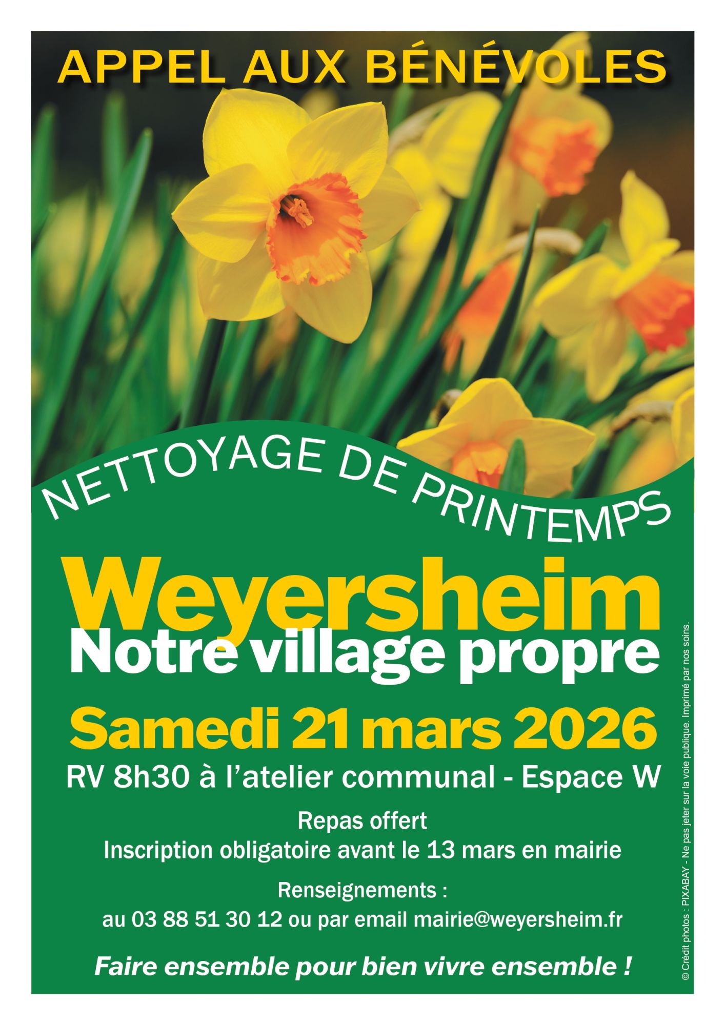 Appel aux bénévoles pour le nettoyage de printemps du ban communal le 21 mars 2026.